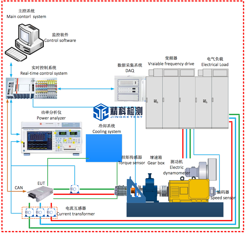 试验台提供与用户采购的冷却系统通讯接口;与功率分析仪的通讯接口;与电气负载的通讯接口。